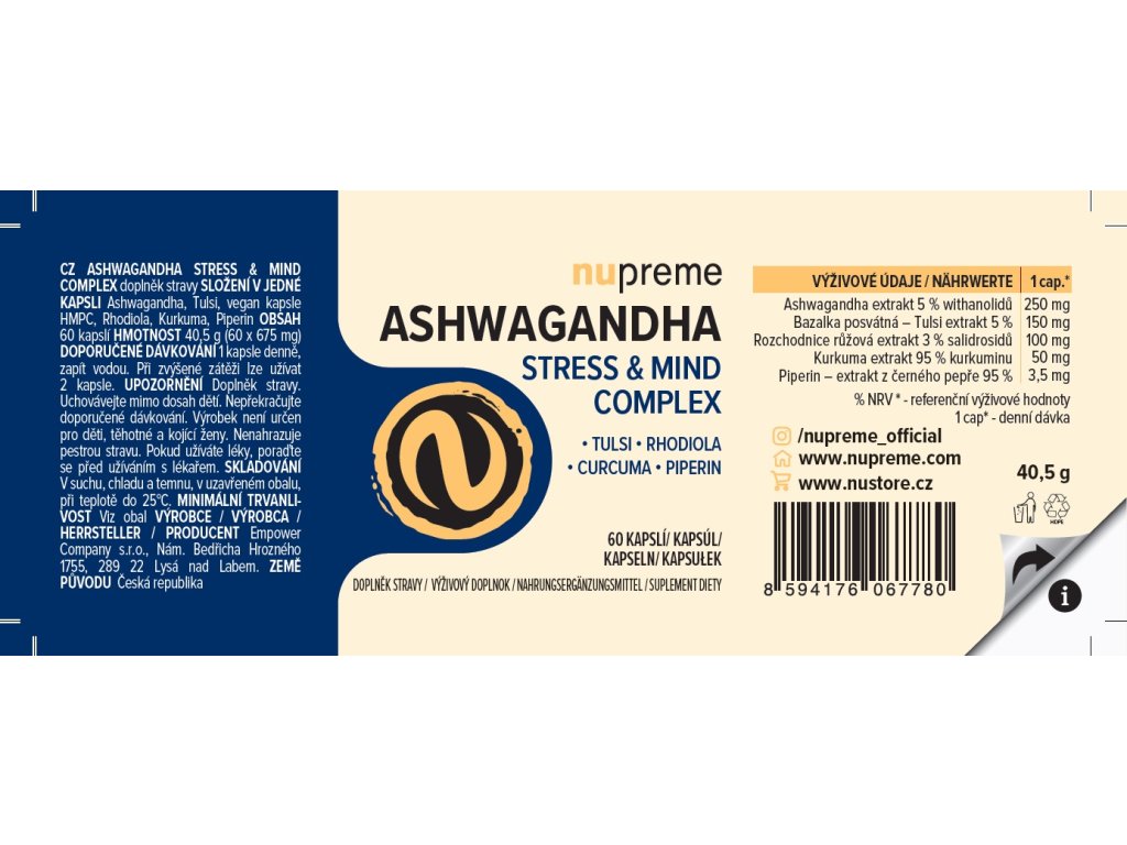 Nepřiměřený stres a únava přináší vaší psychice doslova devastační účinky. Přetížená mysl se cyklí a odmítá pracovat. Ashwagandha complex vytvoří ve vaší hlavě chráněný prostor, ve kterém můžete v klidu přemýšlet, pracovat i snít.