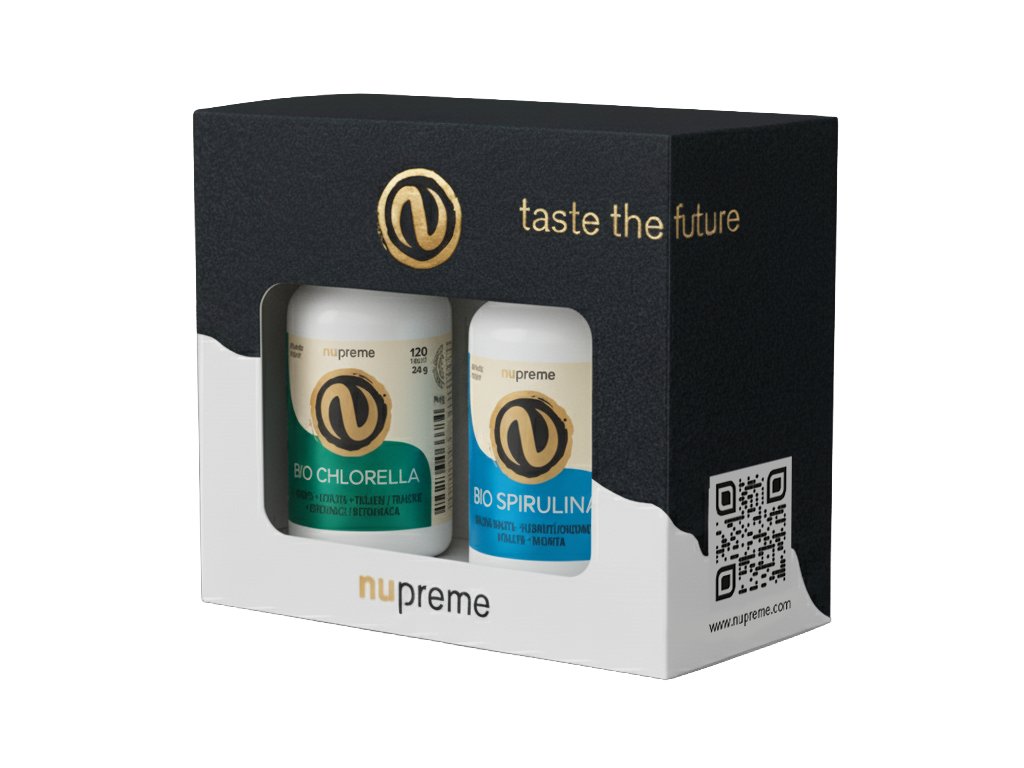 Přinášíme Vám výjimečný balíček v stylové dárkové krabičce: kombinaci chlorelly a spiruliny v bio kvalitě. Chlorella je známá podporou detoxikace a vitality, spirulina zase dodává tělu energii a vitamíny. Společně tvoří ideální podporu pro energii, vitalitu a pohodu.