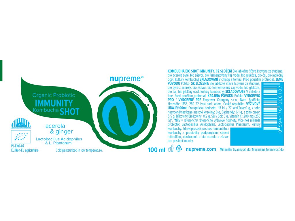 Bio jablečná šťáva lisovaná za studena, bio acerola pyré, bio zázvor, bio fermentovaný čaj (voda, bio glukóza, bio čaj, bio jablečný ocet, kultury kombuchy)