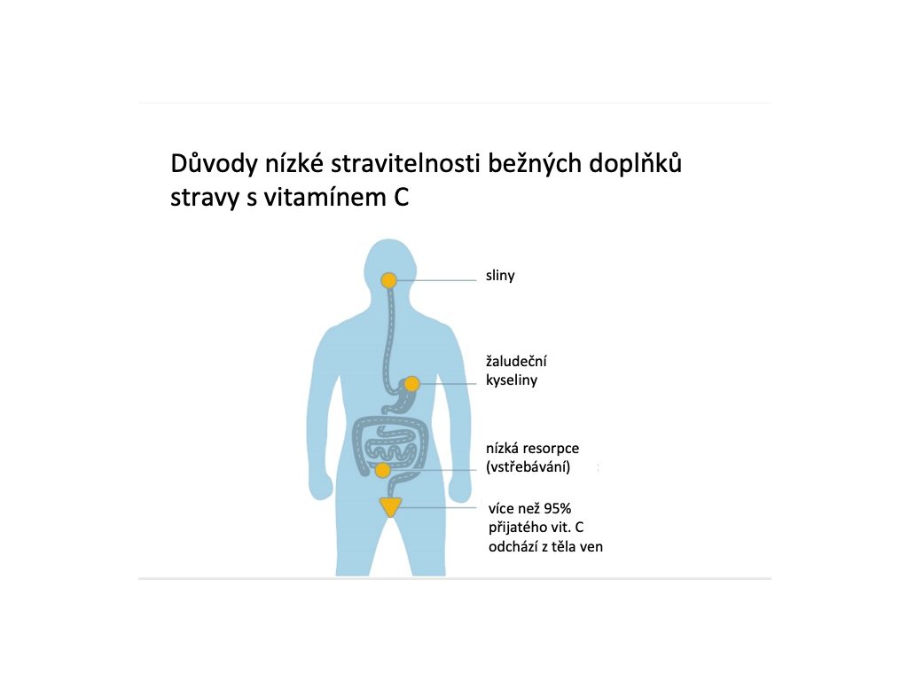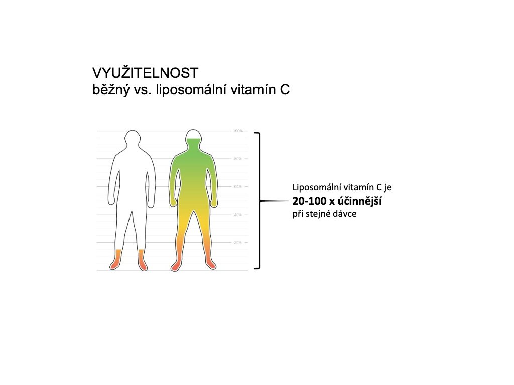 Běžné doplňky s vitamínem C mají velmi nízkou stravitelnost na maximální úrovni přibližně 20 %. Použití liposomální formy zpracování však umožnilo zlepšit biologickou dostupnost na neuvěřitelných 95 % nebo více. Dostat účinnou látku do krve nestačí, doplněk stravy musí ideálně dorazit až přímo do buňky. V krvi můžeme mít spoustu vitamínu C, ale tělo jej nedokáže zpracovat a většinu vyloučí, a ještě tím zatěžujeme ledviny.