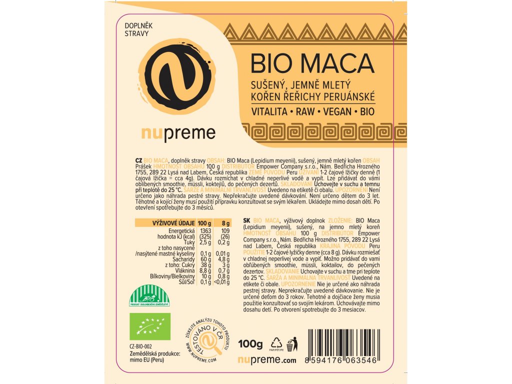 Složení | Řeřicha peruánská - Maca (Lepidium meyenii) sušený jemně mletý kořen. |